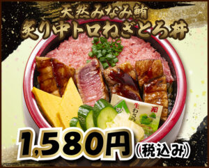味は一級品、見た目だけが規格外の天然みなみ鮪を炙りと特製ダレで仕上げ、店内で手作りした天然みなみ鮪のネギトロとともに、当店自慢の酢飯と一緒にかき込んでほしい一杯です。