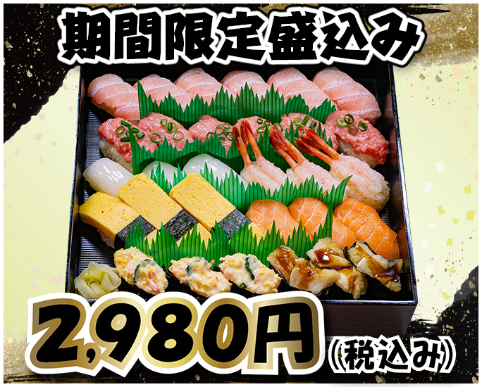 バチまぐろのトロをはじめ、コスパのよい人気の寿司種を詰め込みました。期間限定・お手頃価格で楽しめるおトクな盛込み!